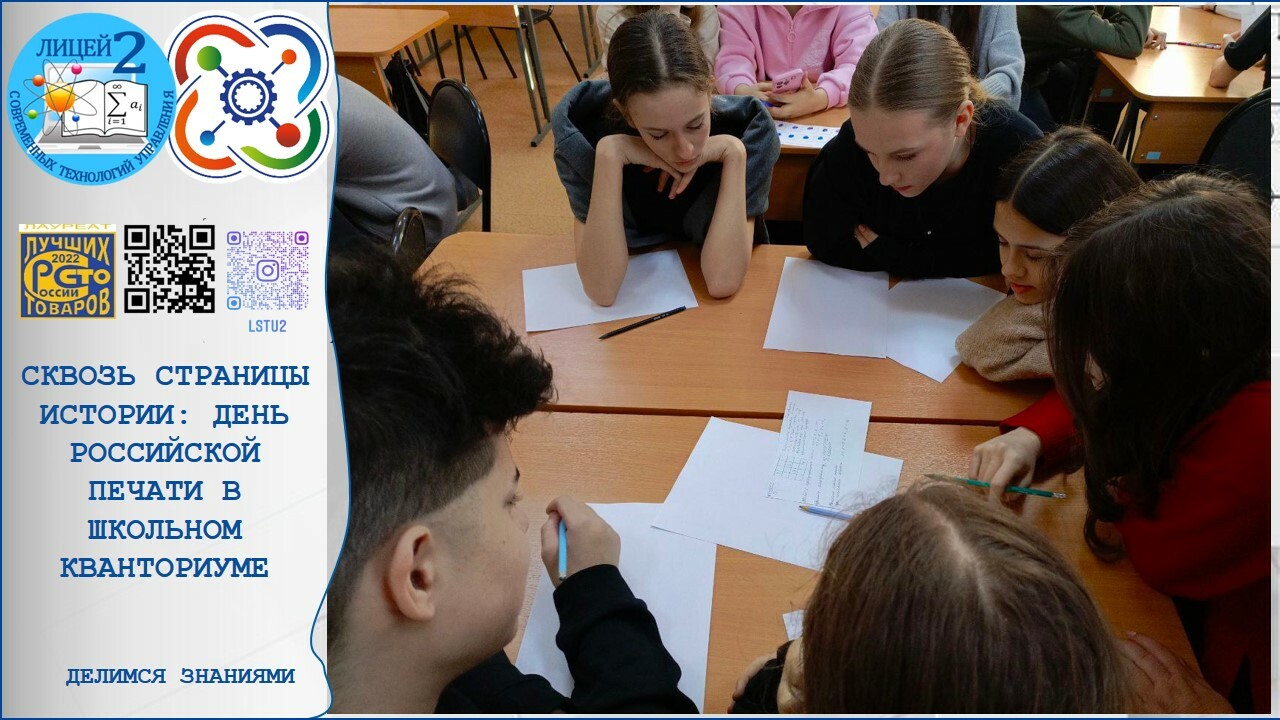 13 января, в День российской печати, на базе школьного Кванториума ЛСТУ №2 состоялся круглый стол в рамках направления «Журналистика». Мероприятие объединило юных журналистов и педагогов, заинтересованных в сохранении исторической памяти и развитии современной журналистики.