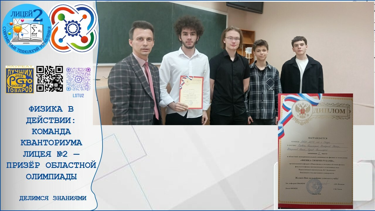 Команда МБОУ «Лицей современных технологий управления № 2» г. Пензы успешно выступила на областной экспериментальной олимпиаде по физике и технологии «Физика своими руками», заняв почётное 3 место. В состав команды вошли обучающиеся разных классов: Гусев Тимофей (10В), Жариков Илья (9Е), Хлебунов Егор (8Е) и Савин Дмитрий (7А), что подчёркивает преемственность и системность подготовки в лицее.