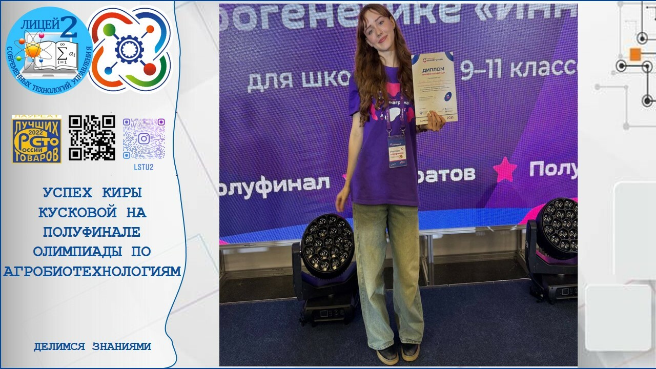 Школьный кванториум лицея №2 г. Пензы представила Кускова Кира — ученица 10 «Г» класса химико-биологического профиля. Для неё участие стало важным этапом профессионального роста, поскольку «Иннагрика» считается одной из самых престижных олимпиад в сфере агробиологии.