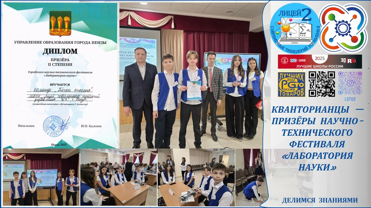 Школьный Кванториум лицея №2 представила команда «Точка кипения», в состав которой вошли учащиеся: Дмитрий Савин (7А), Полина Кручинина, Евгений Столяров и Виктория Шадчнева (8Е). Ребята заранее готовились к участию, разрабатывая проекты и тренируясь в решении прикладных задач.Наставником команды стала Оксана Ивановна Калагина — учитель физики и координатор федерального проекта «Повышение качества математического и естественно-научного образования до 2030 года». Под её руководством школьники освоили методы исследовательской деятельности и научились применять знания на практике.