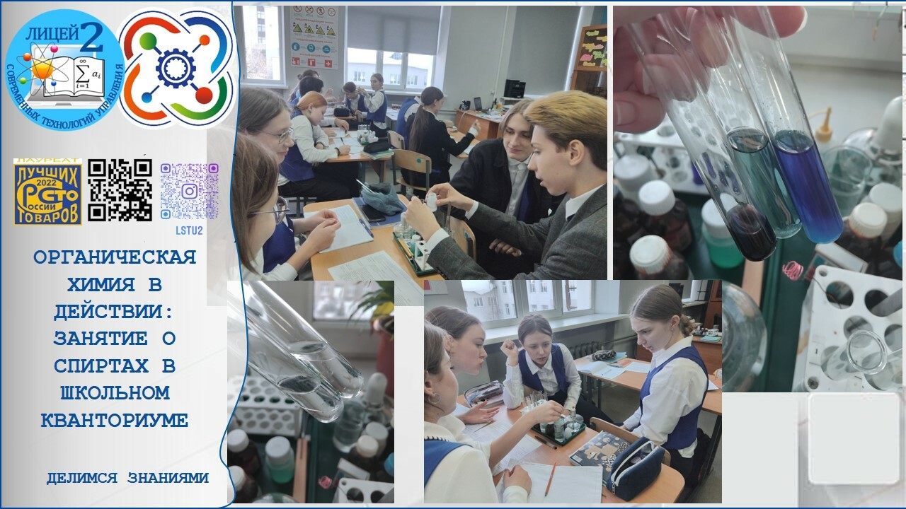 В лаборатории химии Школьного Кванториума МБОУ «Лицей современных технологий управления № 2» г. Пензы прошло практико-ориентированное занятие, посвящённое изучению спиртов — важного класса органических соединений. Работа в формате экспериментов позволила школьникам не только углубить теоретические знания, но и применить их на практике.