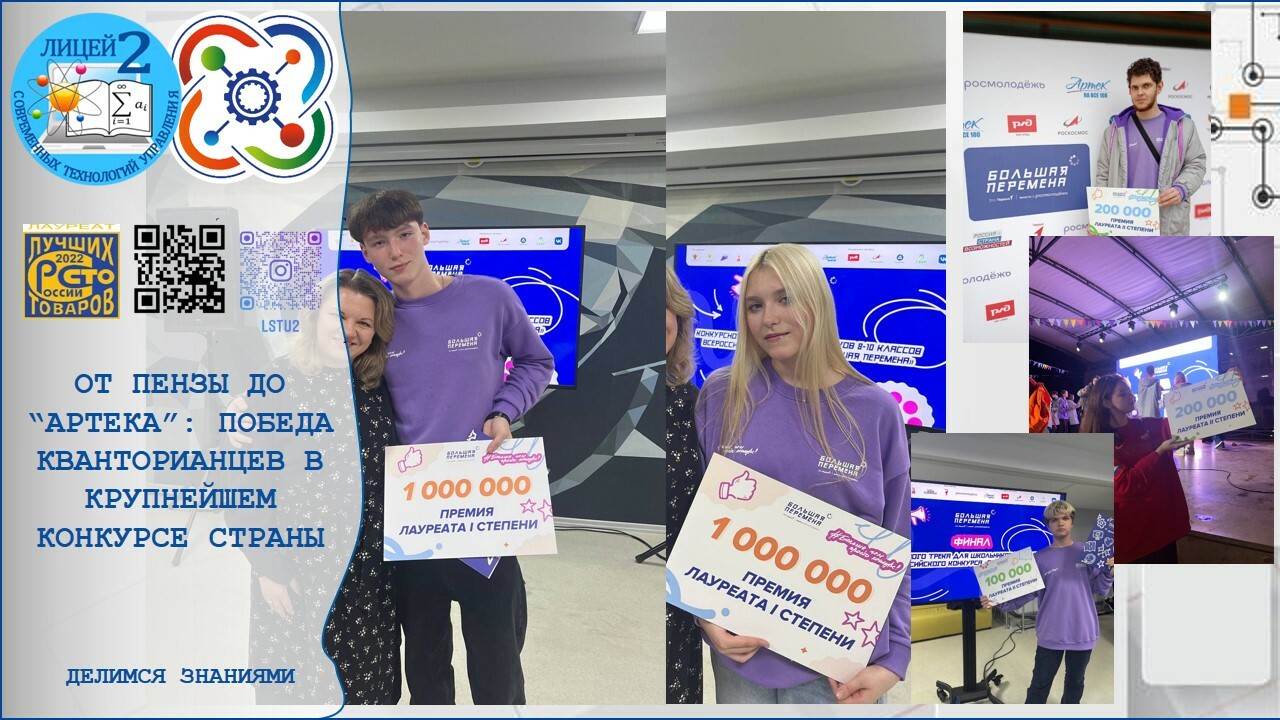 Конкурс «Большая перемена» проводится с 2020 года и является крупнейшей площадкой для выявления и поддержки талантливых школьников России. Победители получают не только финансовые призы, но и дополнительные баллы к портфолио при поступлении в вузы, а наставники — возможность пройти образовательные программы. Участие в «Большой перемене» стало важным шагом к профессиональному и личностному росту юных кванторианцев.