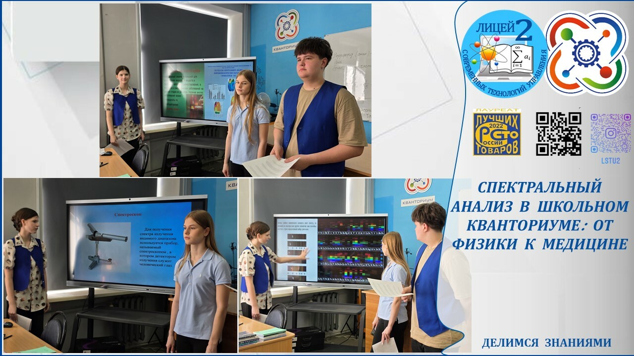 В Школьном Кванториуме МБОУ «Лицей современных технологий управления № 2» г. Пензы состоялось занятие, посвящённое изучению спектрального анализа и его применения в медицине. Тема объединила знания из физики, химии и биологии, что полностью соответствует междисциплинарному подходу, реализуемому в образовательной среде Кванториума.